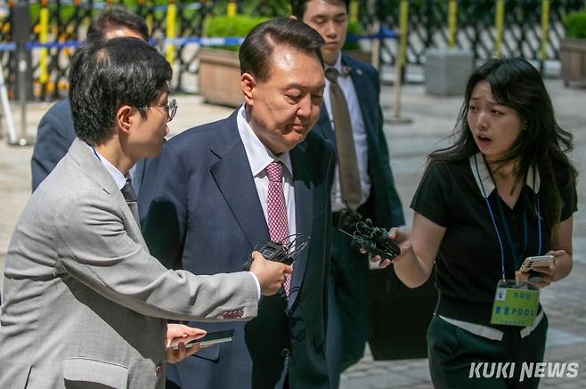 대선 이후 첫 포토라인에 선 윤 전 대통령은 취재진이 ‘대선 결과 어떻게 봤냐?’고 물었지만 대답 없이 ‘윤석열 대통령’을 외치던 지지자들을 응시하면서 천천히 걸어갔다. 내란과 김건희 여사, 순직 해병 관련 특검 출범에 대한 입장을 묻는 질문에도 윤 전 대통령은 침묵했다.