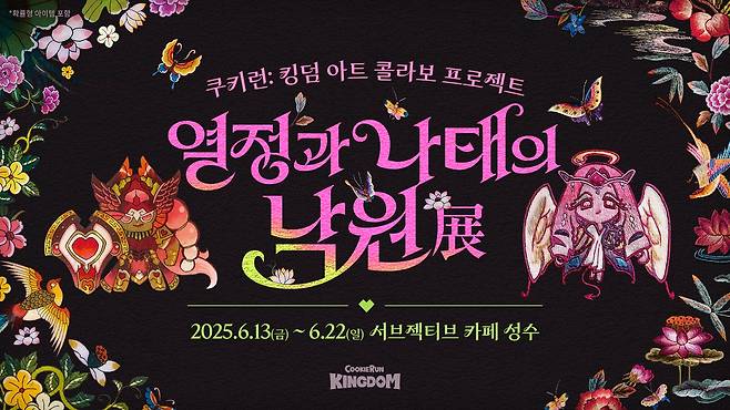 데브시스터즈는 서비스 중인 '쿠키런: 킹덤'을 통해 이달 13일부터 22일까지 성수동 서브젝티브 카페에서 팝업 전시 '열정과 나태의 낙원' 특별전을 오픈한다.