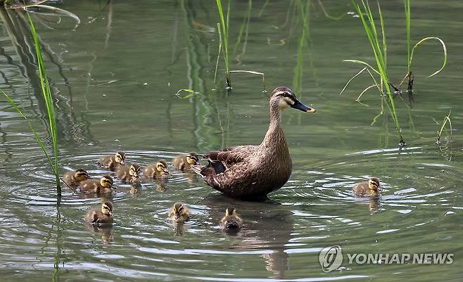 (강릉=연합뉴스) 유형재 기자 = 9일 강원 강릉시의 한 주택가 작은 하천에서 어미 흰뺨검둥오리가 조심스럽게 풀숲을 헤치고 다니며 10여 마리의 새끼를 키우고 있다. 2025.6.9