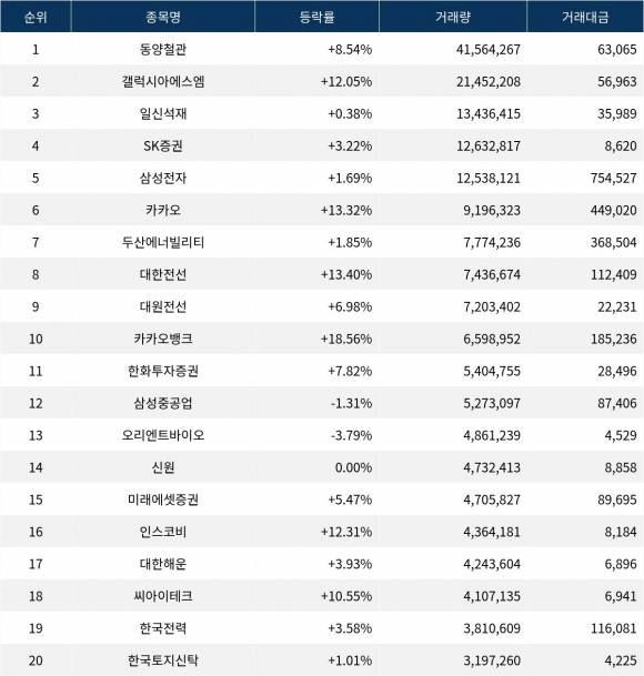 한편, 거래량 상위 20위권 종목들은 한화투자증권(003530) ▲7.82%, 삼성중공업(010140) ▼1.31%, 오리엔트바이오(002630) ▼3.79%, 신원(009270) 보합, 미래에셋증권(006800) ▲5.47%, 인스코비(006490) ▲12.31%, 대한해운(005880) ▲3.93%, 씨아이테크(004920) ▲10.55%, 한국전력(015760) ▲3.58%, 한국토지신탁(034830) ▲1.01% 등의 성적을 기록한다.