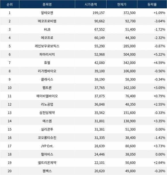9일 한국거래소에 따르면, 시가총액 1위 알테오젠(196170)은 현재가 372,500원으로 전 거래일 대비 1.09% 상승하고 있다.
