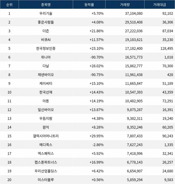거래량 3위인 더즌(462860)는 현재가 3,345원, 등락률은 폭등한 +21.86%이며, 거래량은 27,222,036주다. 4위 비큐AI(148780)는 현재가 1,851원, 등락률은 급등한 +11.57%이며, 거래량은 19,183,621주다. 5위인 한국정보인증(053300)는 현재가 7,620원, 등락률은 폭등한 +23.10%, 거래량은 17,182,400주다. 6위인 위니아(071460)는 현재가 57원, 등락률은 폭락한 -90.70%, 거래량은 16,571,773주를 기록하고 있다. 7위 다날(064260)는 현재가 4,500원, 등락률은 상한가를 기록하며 +28.02%, 거래량은 15,862,777주다. 8위인 제넨바이오(072520)는 현재가 36원, 등락률은 폭락한 -90.75%, 거래량은 11,961,438주다. 9위 케이씨티(089150)는 현재가 4,420원, 등락률은 급등한 +15.10%, 거래량은 11,665,847주다. 마지막으로 10위 한국선재(025550)는 현재가 4,045원, 등락률은 급등한 +14.43%, 거래량은 10,547,393주다.