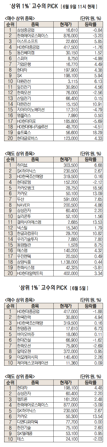 미래에셋증권은 자사 고객 중에서 지난 1개월간 수익률 상위 1% 투자자들의 매매 종목을 집계해 실시간·전일·최근 5일 기준으로 모바일트레이딩시스템(MTS) 상에서 공개하고 있다. 이 통계 데이터는 미래에셋증권의 의견과 무관한 단순 정보 안내이며 각각의 투자자 개인에게 맞는 투자 또는 수익 달성을 보장하지 않는다. 또 테마주 관련 종목은 이상 급등락 가능성이 있으므로 유의해야 한다.