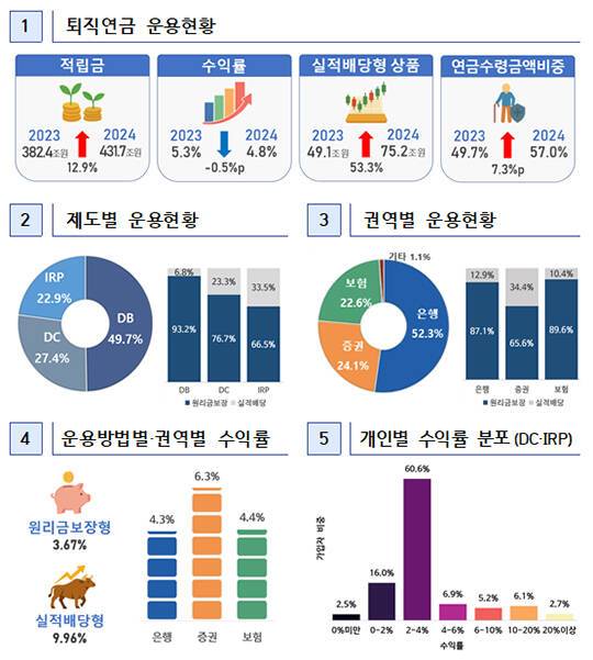 9일 고용노동부와 금융감독원이 발표한 '2024년 말 기준 퇴직연금 적립금 운용현황 통계' 에 따르면 지난해 퇴직연금 431조7000억원으로 제도 도입 이후 최초로 400조원을 돌파했다.
