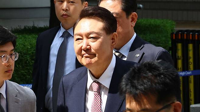 ▲ 윤석열 전 대통령이 9일 서울 서초구 서울중앙지방법원에서 열린 내란 우두머리 혐의·직권남용 권리행사 방해 혐의 사건 6차 공판에 출석하고 있다.