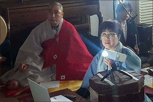 | ▲ 이윤옥과 어산 신덕스님 기자는 여성독립운동가 고 오희옥 지사를 포함한 여성독립운동가에 대한 강연을 했다. 왼쪽 스님은 이날 집전을 맡은 어산 신덕스님이다. |