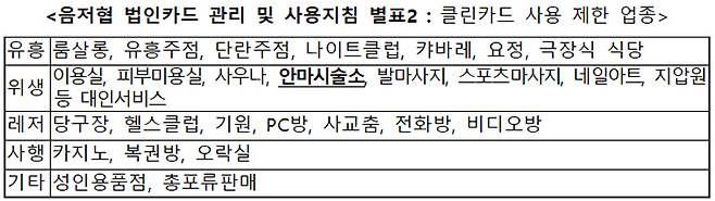 ㅇ 셋째, 법인카드의 안마시술소 사용과 관련하여, 문체부는 음저협이 제출한 사용 내역 및 '법인카드 관리 및 사용지침'에 규정돼 있는 사용 제한 업종을 그대로 인용했습니다.