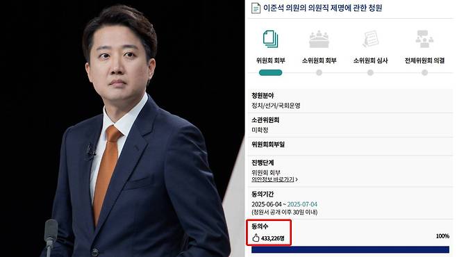 지난 4일 국회 국민동의청원 게시판에 올라온 '이준석 의원의 의원직 제명에 관한 청원'이 9일 14시 기준 43만 3천여 명의 동의를 얻으며 역대 최다 동의 청원 2위에 올랐다. 이 청원은 지난해 12월 '윤석열 대통령 탄핵소추 및 내란죄 수사를 위한 특검법 제정 촉구' 청원의 동의 수(40만 287명 동의)를 뛰어넘은 수치다.