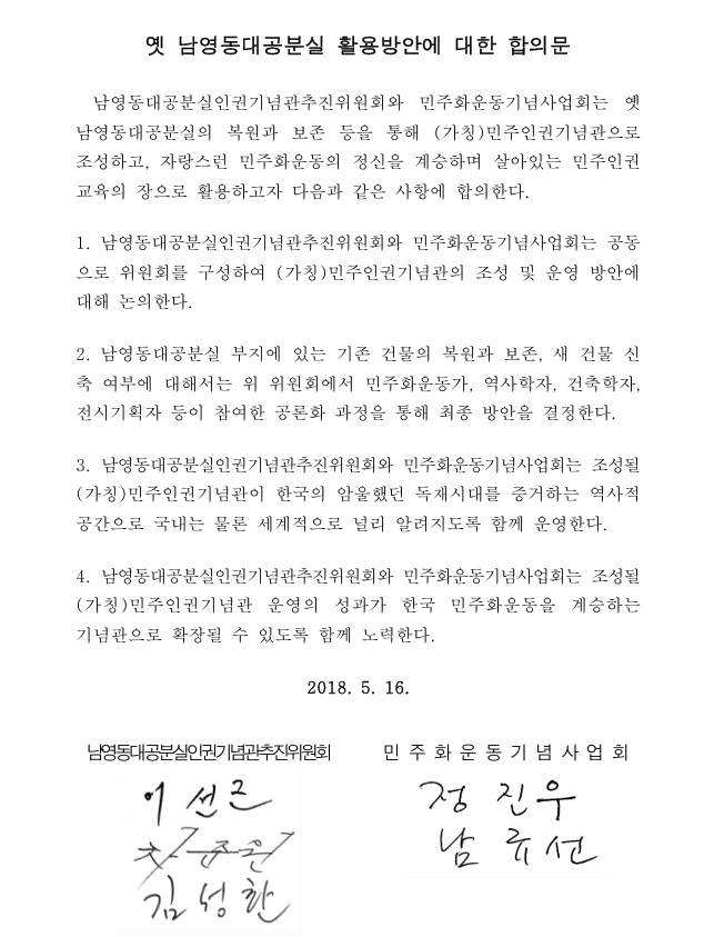 | ▲ 옛 남영동대공분실 활용방안에 대한 합의문 2018년 5월 16일 민주화운동기념사업회와 남영동대공분실인권기념관추진위원회('남영동 사람들'의 전신) 사이에 이루어진 1차 합의문이다. |