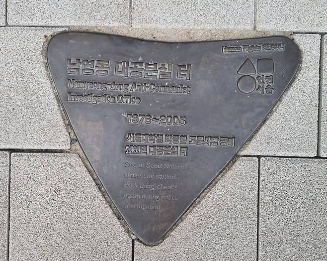 | ▲ 남영동 대공분실터 동판 옛 남영동 대공분실 건물 입구에는 이곳에 서울대생 박종철이 고문 받다 숨진 남영동 대공분실로 사용되던 곳임을 알리는 동판이 있다. |