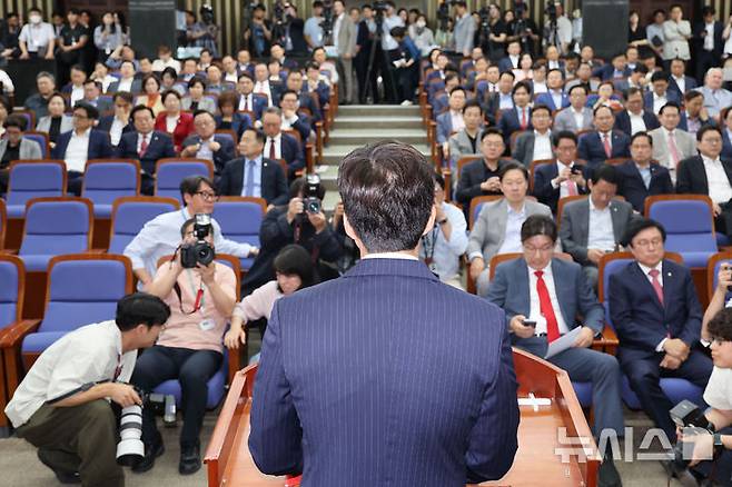 [서울=뉴시스] 권창회 기자 = 김용태 국민의힘 비상대책위원장이 9일 서울 여의도 국회에서 열린 의원총회에서 발언하고 있다. 2025.06.09. kch0523@newsis.com