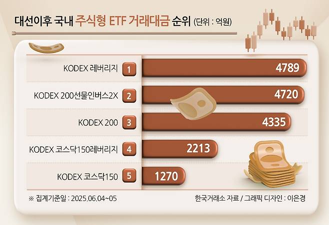 대선 이후 국내 주식형 ETF 거래대금 순위를 봐도 코스피와 코스닥 지수로 구성된 ETF에 쏠려있음을 알 수 있다. ▷KODEX 레버리지(4789억원) ▷KODEX 200선물인버스2X(4720억원) ▷KODEX 200( 4335억원) ▷KODEX 코스닥150레버리지(2213억원) ▷KODEX 코스닥150(1270억원) 순으로 거래대금이 많았다.