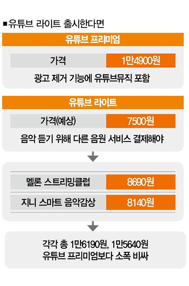 현재 '유튜브 라이트'를 도입한 미국·영국·독일 등 해외시장의 가격은 유튜브 프리미엄의 절반 정도다. 한국에 도입할 '유튜브 라이트'의 가격도 1만4900원의 절반인 7500원에서 설정될 가능성이 있다. 이를 전제로 '유튜브 라이트'에 멜론(기본 요금제 스트리밍클럽·8690원)을 이용한다면 매월 1만6190원을 결제해야 한다.