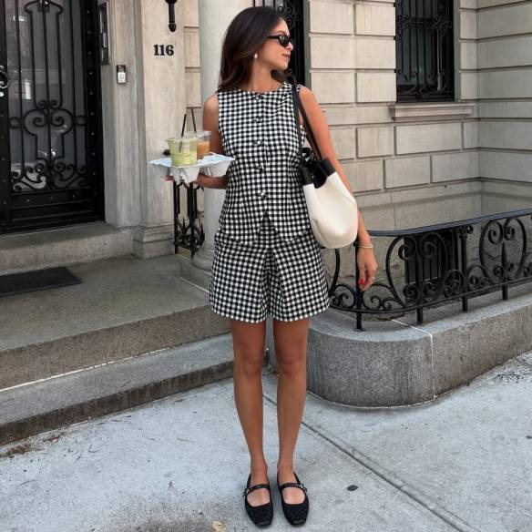 제인 커디 아무리는 단정한 실루엣의 베스트와 쇼츠 셋업으로 블랙 깅엄 을 도시적으로 풀어냈습니다. 리본 디테일의 메리제인 슈즈와 아이보리 숄더백으로 클래식하면서도 실용적인 무드를 연출했네요.