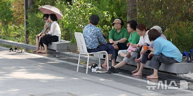 [서울=뉴시스] 김선웅 기자 = 서울 낮 최고기온이 30도를 기록한 9일 서울 종로구 광화문광장에서 시민들이 나무그늘 아래에 앉아 흐르는 물에 발을 담그며 더위를 식히고 있다. 2025.06.09. mangusta@newsis.com