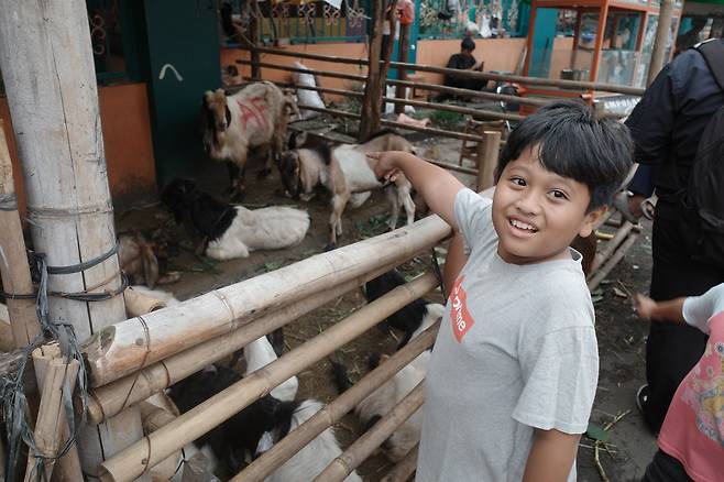 | ▲ 인니 탕에랑에 위치한 염소 농장 인니 탕에랑에 사는 한 아이가 염소 농장에서 염소와 놀고 있다 |