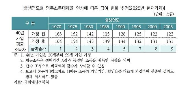 20세부터 59세까지 40년간 가입한 평균 소득자의 급여(현재가치 기준)를 보면 1970년생은 법 개정 전 월 163만원에서 개정 후 164만원으로 1만원 늘어난다.