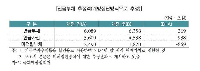 예정처는 다만 "개정 법률에 따른 제도 운영 시에도 미적립부채는 남아있어 추가적인 재정 안정화 조치가 필요한 상황"이라고 지적했다.