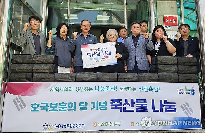 (양양=연합뉴스) 9일 강원 속초양양축산농협 본점에서 열린 나눔축산 호국보훈의 달 기념 축산물 나눔 행사에서 강원농협 관계자들이 대한민국 전몰군경 미망인회 양양군지회 회원 가구에 축산물 선물 세트를 전달하고 있다. 2025.6.9 [농협 강원본부 제공. 재판매 및 DB 금지]