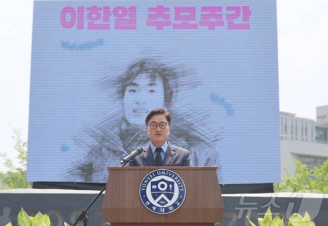 (서울=뉴스1) 오대일 기자 = 우원식 국회의장이 9일 서울 서대문구 연세대학교에서 열린 제38주기 이한열 추모제에서 추모사를 하고 있다. (공동취재) 2025.6.9/뉴스1