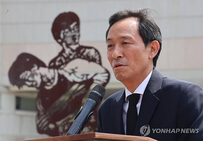 (서울=연합뉴스) 류영석 기자 = 대통령실 정무수석 비서관으로 임명된 우상호 이한열기념사업회 이사장이 9일 서울 서대문구 연세대학교 이한열 동산에서 열린 제38주기 이한열 추모식에서 인사말을 하고 있다. 2025.6.9 [공동취재]