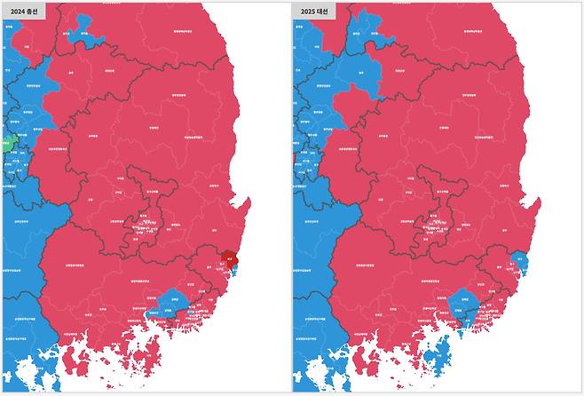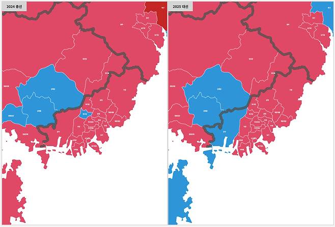 | ▲ 2024총선 결과와 2025대선 득표율 총선 선거구 시뮬레이션 - 영남권 |