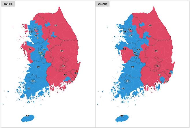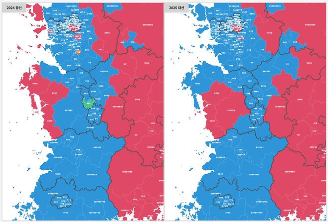 | ▲ 2024총선 결과와 2025대선 득표율 총선 선거구 시뮬레이션 - 전국 |