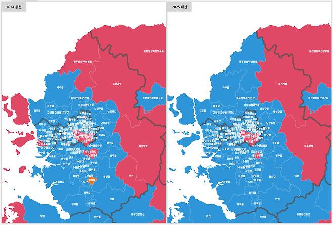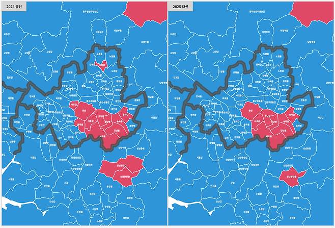 | ▲ 2024총선 결과와 2025대선 득표율 총선 선거구 시뮬레이션 - 서울 |