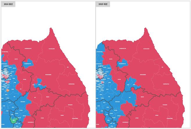 | ▲ 2024총선 결과와 2025대선 득표율 총선 선거구 시뮬레이션 - 강원 |