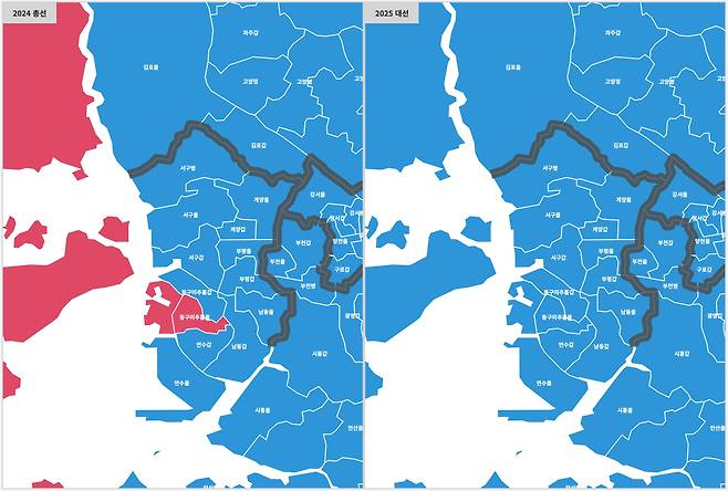 | ▲ 2024총선 결과와 2025대선 득표율 총선 선거구 시뮬레이션 - 인천 |
