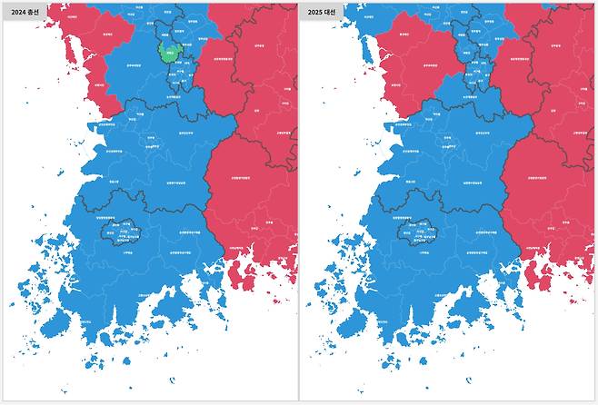 | ▲ 2024총선 결과와 2025대선 득표율 총선 선거구 시뮬레이션 - 호남권 |