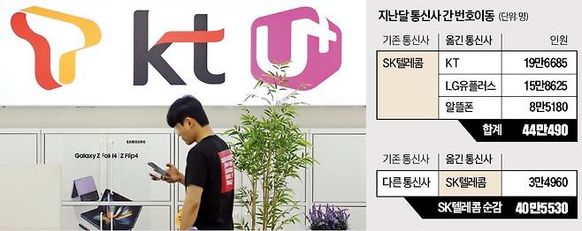 9일 한국통신사업자연합회(KTOA)에 따르면 지난달 SK텔레콤에서 KT, LG유플러스, 알뜰폰(MVNO)으로 통신사를 옮긴 사람은 44만490명이다. 다른 통신사에서 SK텔레콤으로 번호 이동한 3만4960명을 빼면 지난달에만 SK텔레콤 가입자가 40만5530명 순감했다. 지난 4월 22일 SK텔레콤이 유심 정보 해킹 사실을 발표한 이후 가입자가 급감하면서 4월 순감 인원도 11만4330명에 달한다. 두 달 동안 SK텔레콤을 이탈한 사람이 51만9860명에 이른다. 지난달 전체 번호이동 건수는 93만3509건으로 전년 동기 대비 68.1% 늘었다. 단통법이 시행된 2014년 10월 이후 최고 수치다.