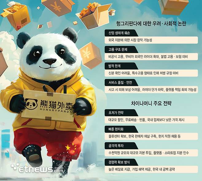최근에는 헝그리판다가 한국에 본격적으로 상륙하면서 어번 서비스에 기반한 플랫폼 분야에서도 중국 자본의 공습이 현실화되고 있다. 배달 플랫폼 분야에서는 불법 무비자 라이더 문제까지 낳고 있어 업계의 우려가 더욱 커지는 상황이다.