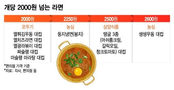 업계에 따르면 현재 개당 2000원이 넘는 라면은 주로 편의점에서 판매되는 제품들이고 △농심 둥지냉면 2250원 △오뚜기 열튀김우동 대컵, 열치즈라면 대컵, 열광라볶이, 짜슐랭 대컵, 마슐랭 마라탕 2000원 △삼양식품 탱글 대컵 2500원 △하림 더미식 장인라면 2200원 등이다.