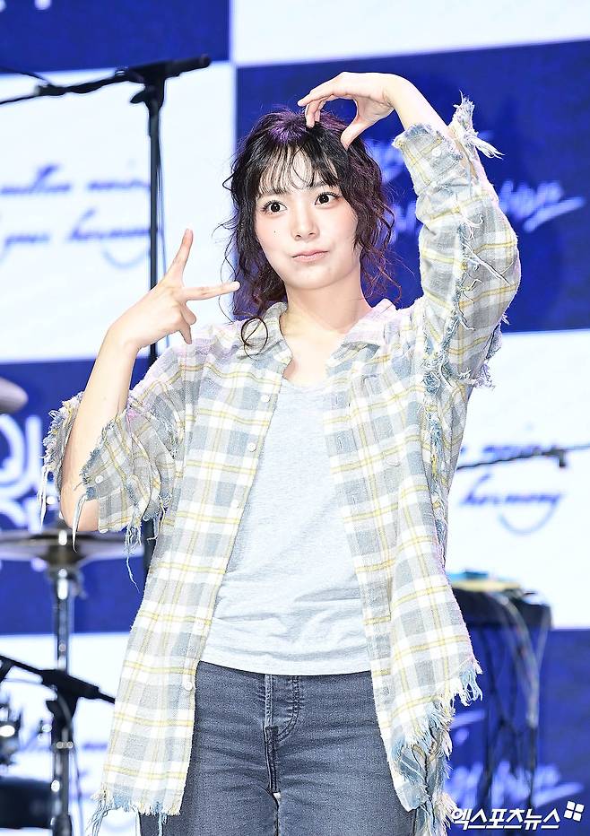 이날 쇼케이스에 참석한 QWER 시연이 포토타임을 갖고 있다.