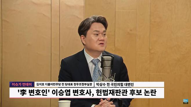 ☆ 박상수 : 네, 고사를 해야죠. 이승엽 변호사가 있다는 그 대형 로펌에서도요. 사건 할 때, 변호팀을 꾸릴 때 혹시 컨플릭트 체크(conflict check)를 합니다. 혹시 갈등 관계가 있는지에 대해서. 내가 이해 충돌에 걸린다 컨플릭트다 하면 먼저 콜하고 그 변호팀에서 빠져야 되는 거예요. 그러니까 이승엽 변호사가 이거는 이재명 대통령한테 부담 주지 않도록 스스로 고사하시는 것이 가장 좋고 이재명 대통령도 3명 중 2명 임명하는 거 아닙니까? 이렇게 논란이 되는 이승엽 변호사는 빼고 나머지 2명을 임명하는 게 맞다고 봅니다.