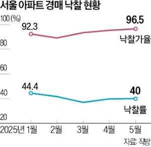 지난달 서울 아파트 경매 낙찰가율(감정가 대비 낙찰가 비율)이 96.5%까지 뛴 것으로 나타났다. 2022년 6월(103.0%) 후 약 3년 만에 가장 높은 수준이다. 낙찰률(경매 건수 대비 낙찰 건수 비율)은 40%대에 머물고 있어 수요자가 선별적으로 경매 물건을 찾고 있는 것으로 해석된다.