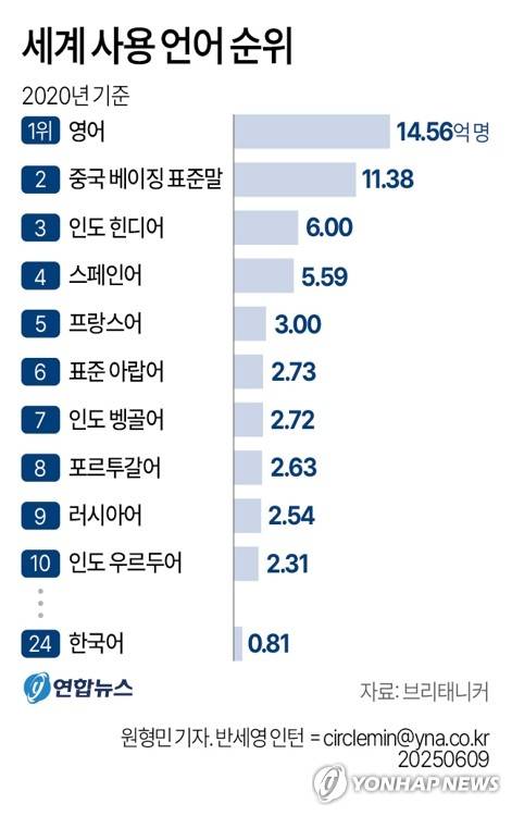 (서울=연합뉴스) 원형민 기자 = 브리태니커에 의하면 2020년을 기준으로 전 세계에서 가장 많이 사용되는 언어 24위에 한국어가 올라가 있다.