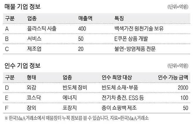 신기업을 인수하려는 기업도 있다. 반도체 장비 제조업체인 D사는 반도체 소재·부품 제조기업 인수를 희망하고 있다. 인수 가능 금액은 2000억원이다. 에너지 저장장치(ESS)·친환경 에너지 분야 상장사인 E사는 전기차 충전 등 에너지 관련 사업이나 ESS 분야 기업을 찾고 있다. 인수 가능 금액은 100억원이다. 포장지 제조 분야 전문기업인 F사는 종이 쇼핑백 제조기업 인수를 원하고 있다. 인수 가능 금액은 50억원이다.