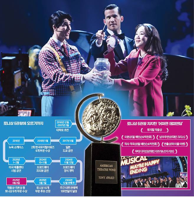 ‘어쩌면 해피엔딩’은 8일(현지시간) 미국 뉴욕 라디오시티 뮤직홀에서 열린 제78회 토니상 시상식에서 작품상, 극본상, 연출상, 작사·작곡상, 남우주연상, 무대디자인상 등 6개 부문을 휩쓸었다. 국내에서 초연된 창작 뮤지컬이 미국 브로드웨이에 진출해 토니상을 받은 것은 이번이 처음이다. 지난해 한국 창작 뮤지컬 ‘위대한 개츠비’가 토니상 의상디자인상을 받았지만 이 작품은 한국 공연을 건너뛰고 처음부터 브로드웨이에 진출했다는 점에서 차이가 있다.