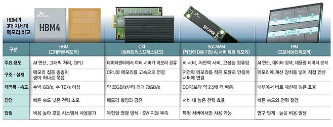 반도체 업계가 불을 켜고 제2의 HBM 찾기에 나선 이유다. 특히 삼성전자, SK하이닉스, 마이크론 등 메모리 3사는 발열은 낮지만 속도가 비교적 빠른 CXL(컴퓨트익스프레스링크)·SoCAMM(저전력 D램 기반 AI 서버 특화 메모리)·PIM(프로세싱인메모리) 개발에 박차를 가하고 있다.