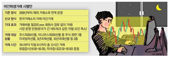 오후 6시부터 다음날 오전 6시까지 파생상품 야간 시장이 열리면서 투자자들은 밤 시간에 일어난 미국·유럽 뉴스에 보다 쉽게 실시간으로 대응할 수 있게 됐다. 파생상품 야간 시장이 열리는 시간은 미국증시(오후 10시 30분~익일 오전 5시)와 거의 중복된다.