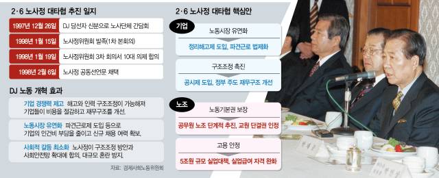 김대중 정부가 마주한 당시의 경제 상황은 처참했다. 외환보유액이 39억 달러까지 급감해 국가 파산 위기였고 기업들의 줄도산으로 대량 실업이 발생했다. 이 같은 상황 속에 이뤄진 2·6 노사정 대타협은 역대 정부의 유일한 ‘노사 빅딜’로 평가된다. 초유의 경제위기 속에서 기업 경쟁력과 사회안전망을 동시에 높이는 구조 개혁을 단행한 것이다. 정리해고제 도입, 파견법 법제화, 노동조합 활동 보장(단체교섭권·단체행동권) 등 노사 양보 없이 추진할 수 없는 과감한 개혁안이 여기에 담겼다.