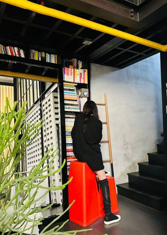 사진 속 고현정은 녹음실에서 헤드폰을 착용하고 카메라를 응시했다. 또한 검은색 원피스를 입고 붉은색 입방체 모양의 의자에 앉아 어떤 책을 읽을지 고르는 모습이다.