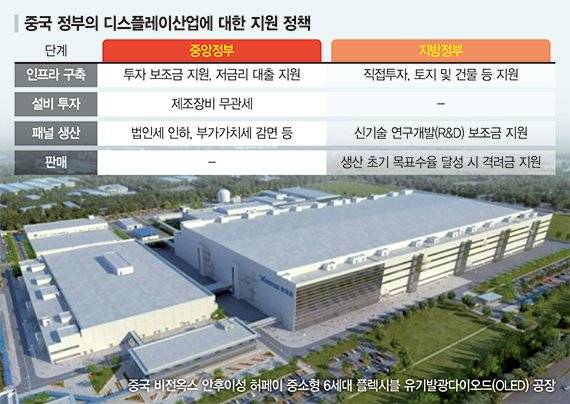 9일 업계에 따르면 중국 정부는 디스플레이 육성을 위해 △인프라 구축 △설비투자 △패널 생산 △판매 등 모든 단계에 걸쳐 전방위 지원을 하고 있다.