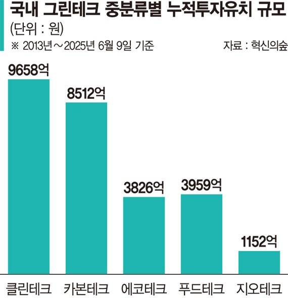 기후테크는 크게 △클린테크 △카본테크 △에코테크 △푸드테크 △지오테크로 분류되는데, 지난 5년간 누적 투자액으로 보면 클린테크와 카본테크에 투자가 집중돼 있다.