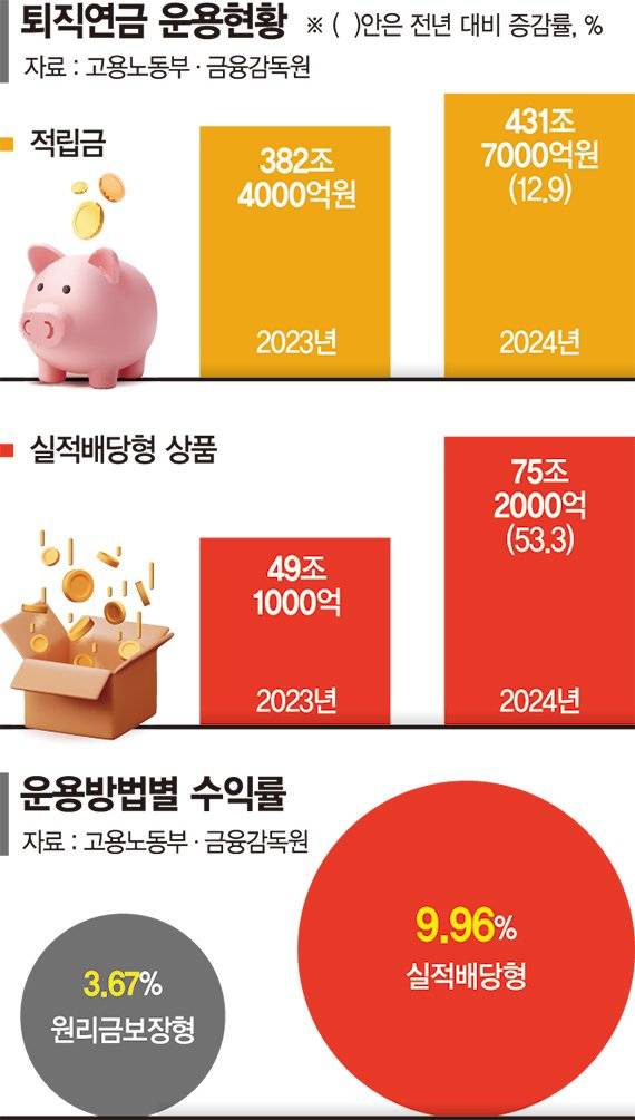 운용방법별로는 전체 적립금 가운데 원리금보장형(대기성자금 포함)이 356조5000억원(82.6%), 실적배당형이 75조2000억원(17.4%)으로 여전히 원리금보장형이 대부분을 차지했다.