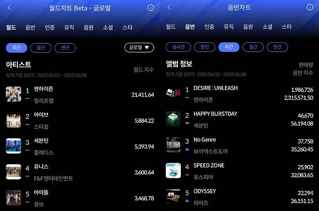 주간 음반차트에서도 엔하이픈이 정상에 올랐다. 엔하이픈은 여섯 번째 미니 앨범 ‘디자이어 : 언리시(DESIRE : UNLEASH)’로 6월 2주 음반 지수 231만5571.50점 (판매량 198만6729장)을 기록했다.