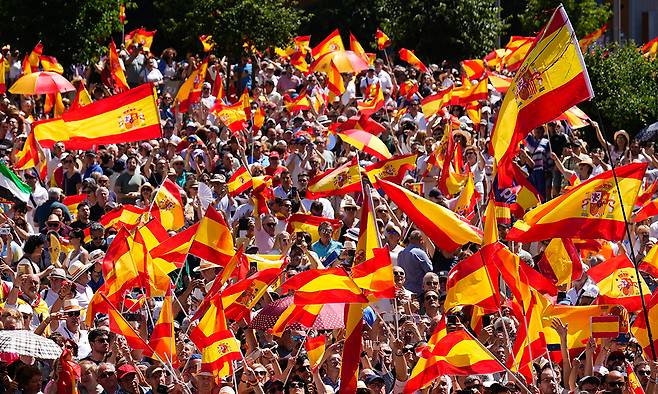 8일(현지시간) 스페인 일간 엘파이스 등에 따르면 이날 수도 마드리드에 위치한 에스파냐 광장에서 보수 야당인 인민당(PP)이 여당을 규탄하는 집회를 개최했다. ‘마피아 아니면 민주주의’를 표어로 한 이날 집회는 주최 측 추산 10만여명이 인원이 30도가 넘는 폭염 속에서도 참여해 스페인 국기를 손에 든 채 대형 스크린을 통해 방송되는 연설을 시청하며 조기 총선을 요구하는 구호를 외쳤다. 알베르토 누녜스 페이호 PP 대표는 “부패를 은폐하기 위해 더 많은 부패를 조장할 수 있는 사람들을 권력에 앉힐 수 있는 정부를 마피아라고 부른다. 민주주의에 항복하고 (조기) 선거를 실시하라”며 목소리를 높였다.