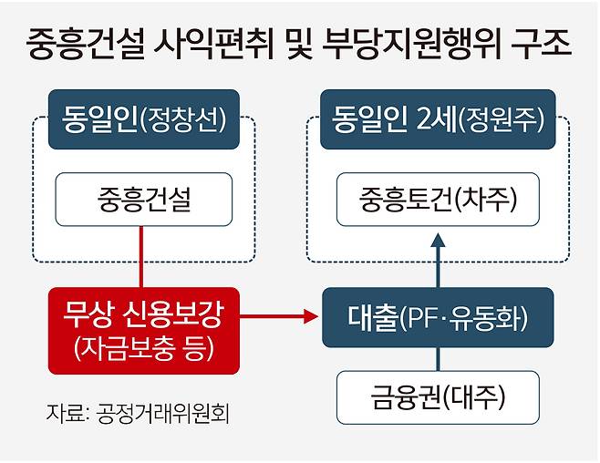 공정위에 따르면 중흥토건은 2007년 정 부회장이 인수할 당시 가치가 12억원에 불과한 전남지역 소규모 건설사였다. 중흥그룹은 기존 중흥건설 중심의 사업조직과 경영구조를 정 부회장 소유의 중흥토건 중심으로 개편하기 위해 지원에 나섰다. 중흥토건은 그룹 내 매출 집중 대상으로 선정됐고, 계열 편입 직후부터 내부 일감을 몰아 받으며 빠르게 성장했다. 2017년까지 내부거래 비중이 90%를 초과할 정도였다.